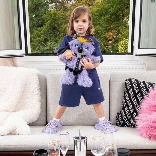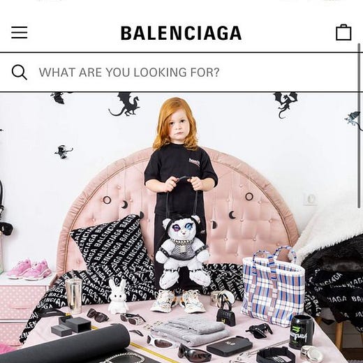 In her tweet, she shared four images from Balenciaga’s website. Two are from the Gift Shop campaign featuring young children, who I would estimate to be 3 to 4 years old, holding teddy bear handbags with BDSM-styled outfits. (Some argue that they are goth outfits, um, okay) The children are surrounded by items you can purchase at Balenciaga’s gift shop, such as wine glasses, flasks, jewelry, and dog collars, to name a few.