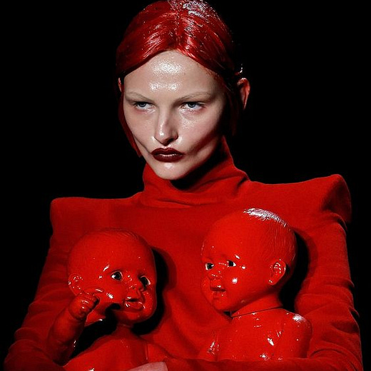 In the viral tweet thread, an image of a woman dressed all in red holding red dolls was identified as Lotta Volkova. However, later in the thread, it was clarified that this was not Lotta Volkova but a model who appeared on the catwalk of the Mercedes-Benz China Fashion Week on March 31, 2016, according to Getty Images. The model displayed fashion by Sheguang Hu, a Beijing-based haute couture designer who posted a similar photo to his Instagram account on April 2, 2016.