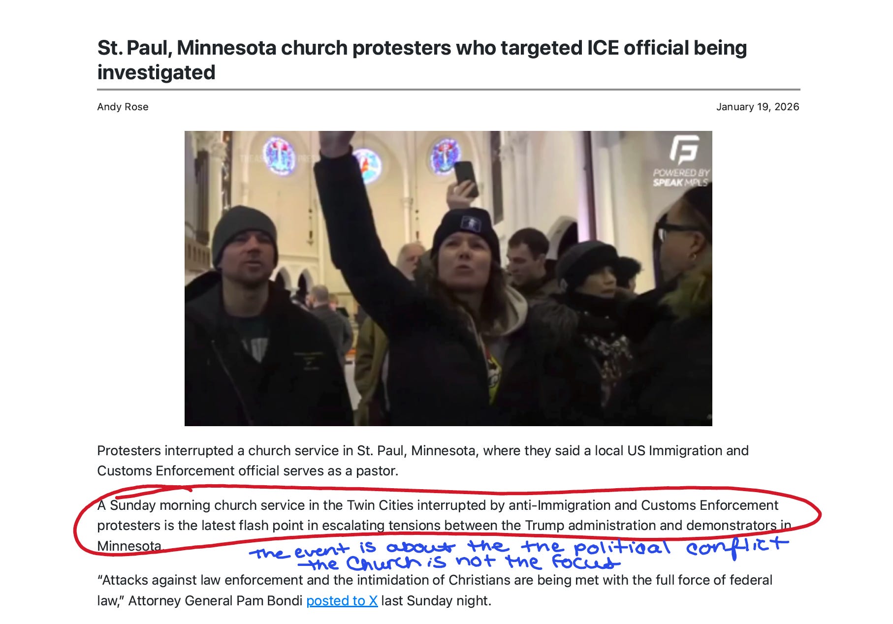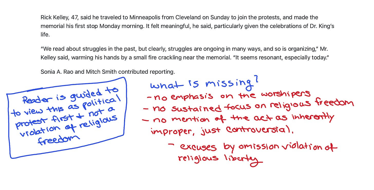 And the Times? “Protest at Minnesota Church Service Adds to Tensions.” Notice the word choice: it’s a “protest,” not a disruption or a storming. And it’s not really about the church at all—it’s about “tensions over ICE tactics.” The church is incidental.