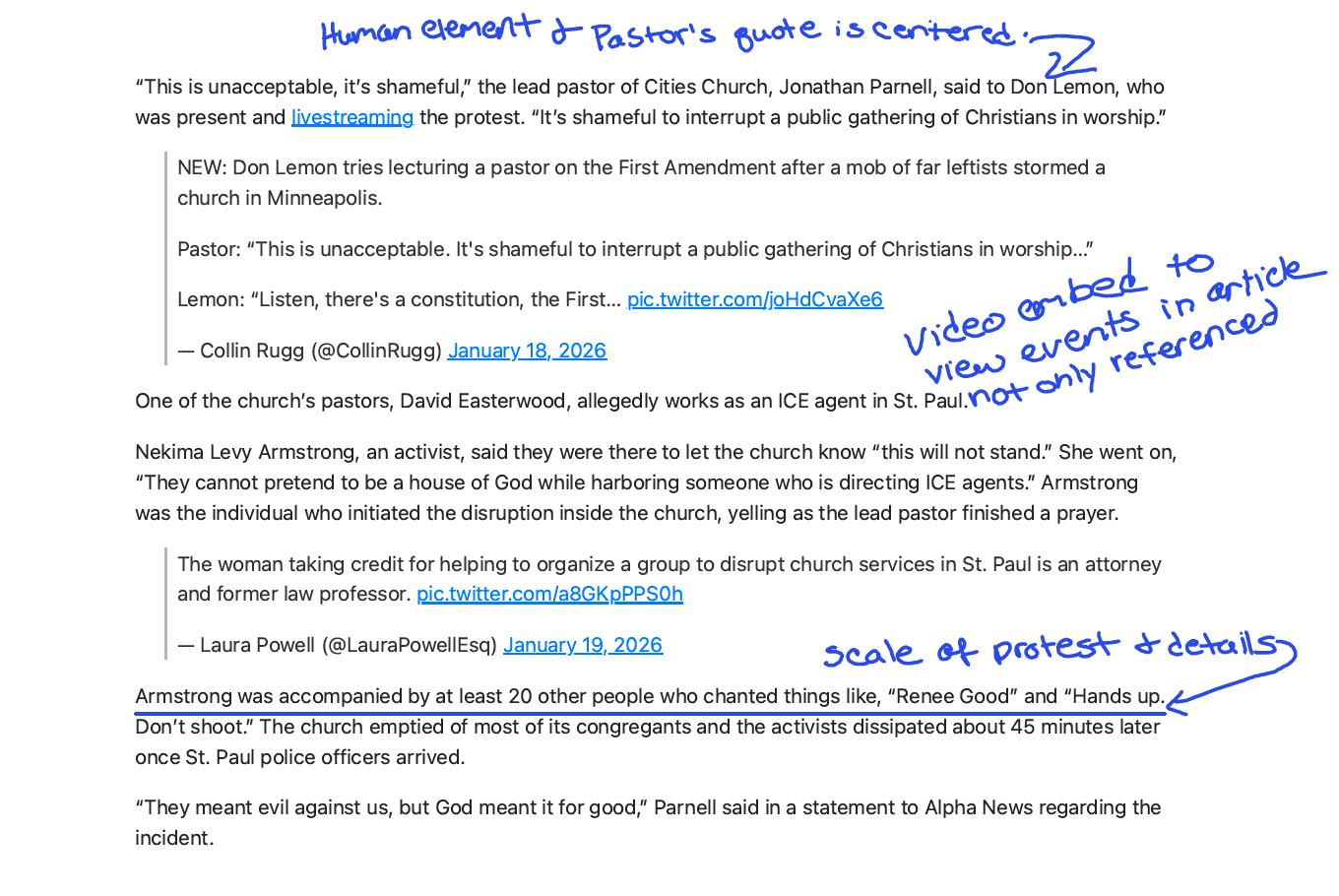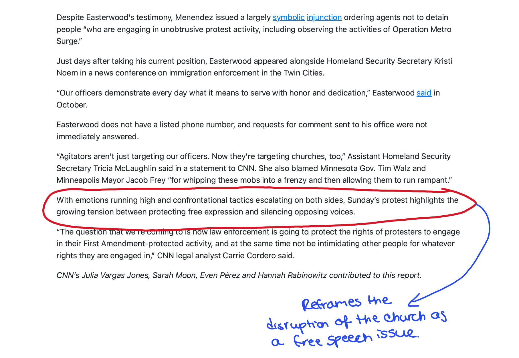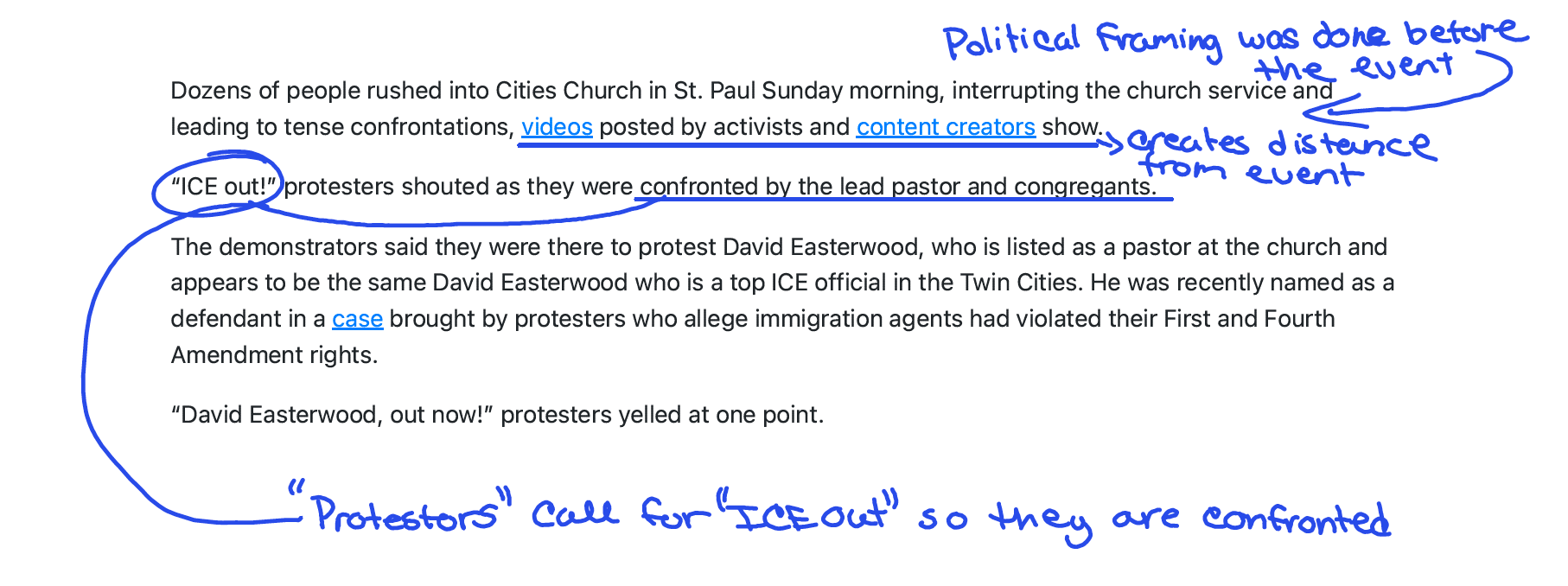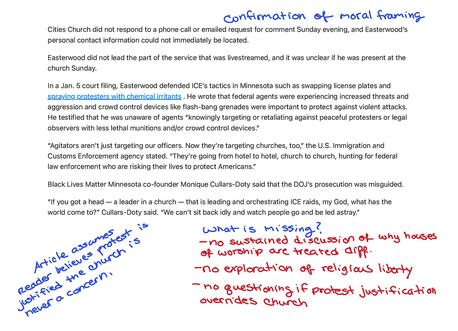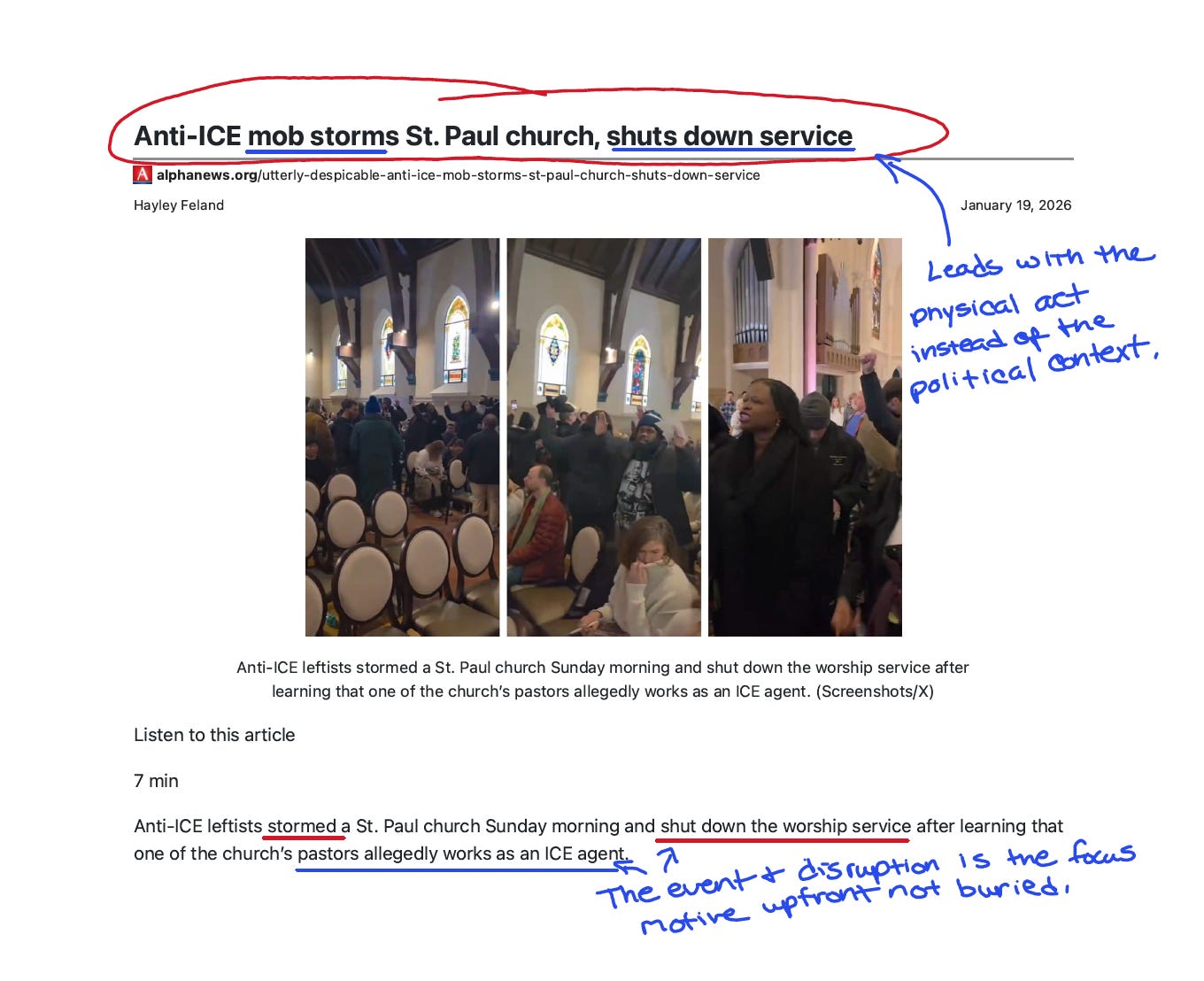 “Violent tactics.” “Illegal arrests.” These characterizations of ICE—sourced to the protesters’ allegations—appear before the reader fully understands what happened to the worshipers.