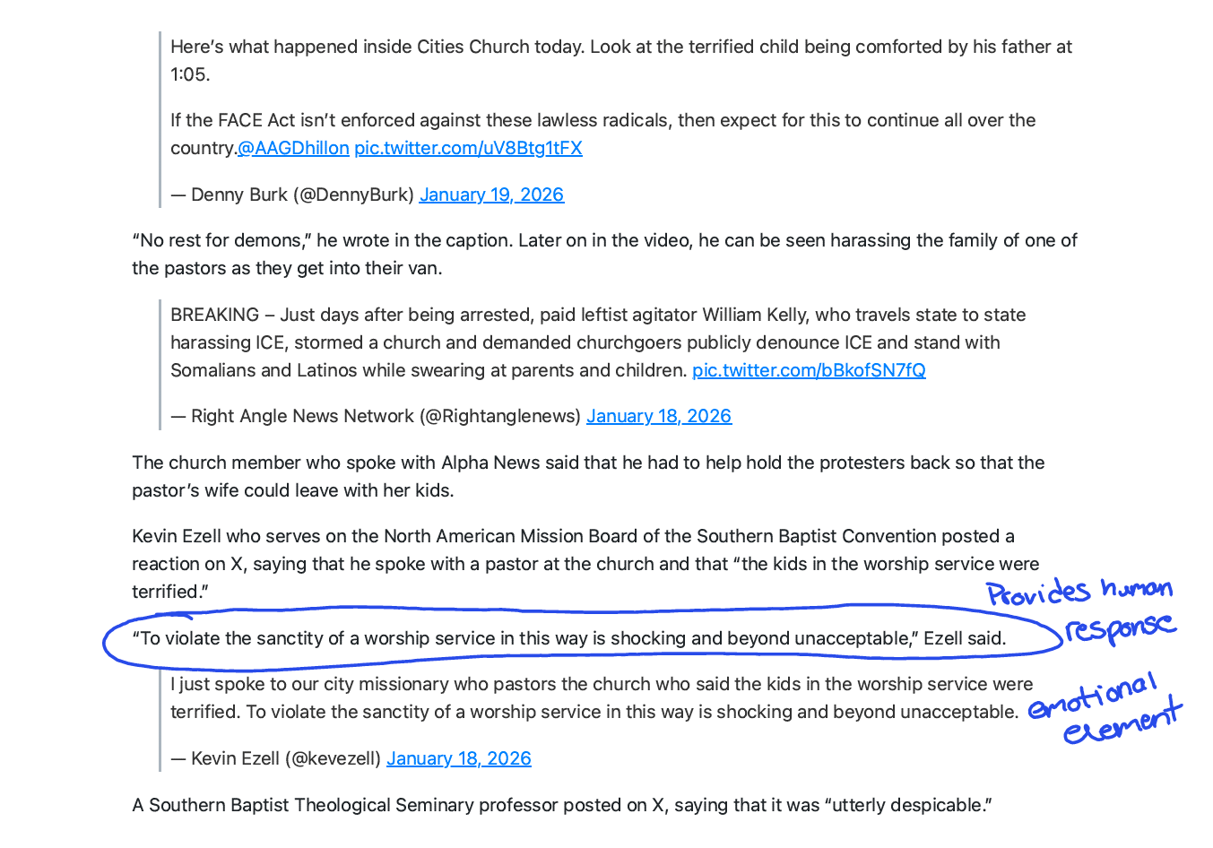 Alpha News includes the eyewitness fear. The children’s terror. The direct quotes about the sanctity of worship being violated. The emotional reality of what it felt like to be inside that church.