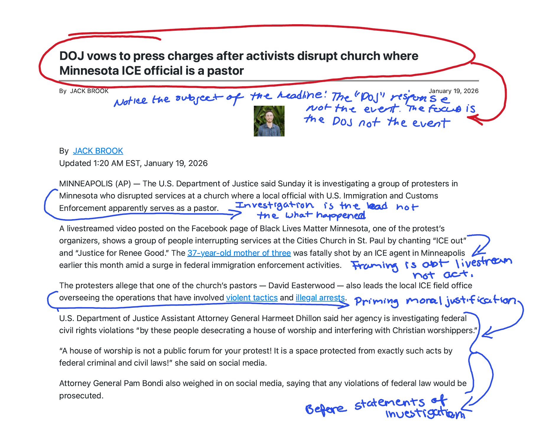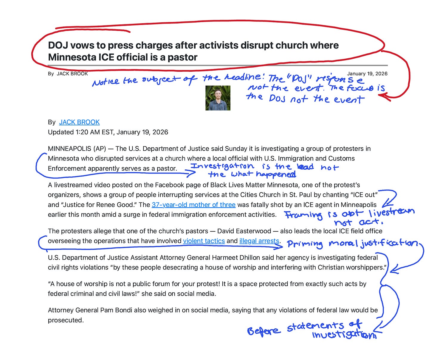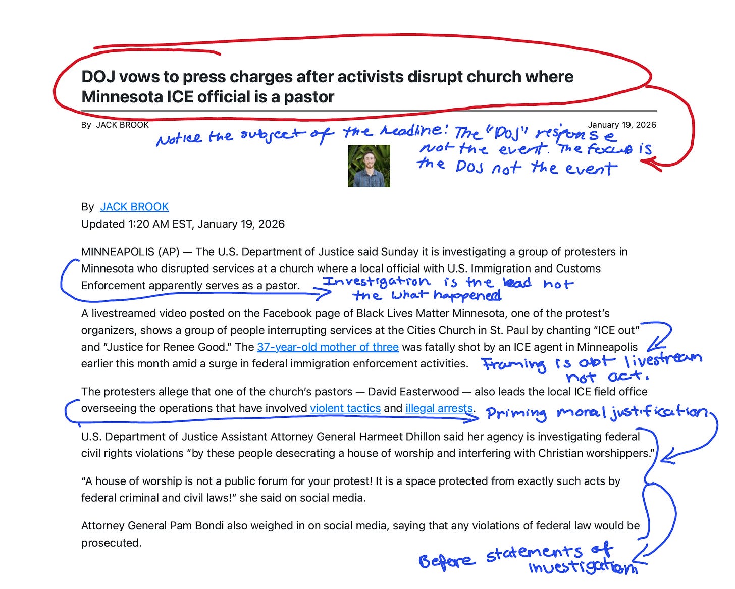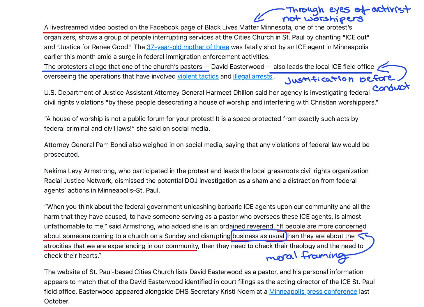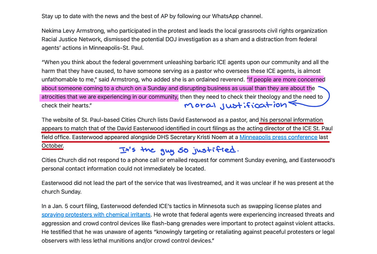 The AP lead mentions that one of the church’s pastors “apparently serves” as an ICE official. By paragraph four, we’re learning that “the protesters allege that one of the church’s pastors—David Easterwood—also leads the local ICE field office overseeing the operations that have involved violent tactics and illegal arrests.”
