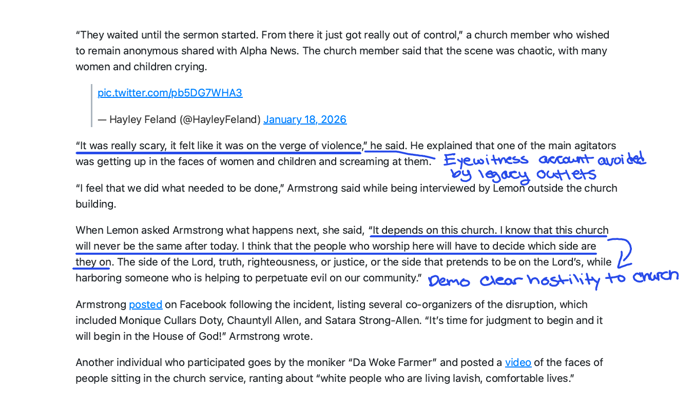 No questioning whether protest justification overrides church sanctity. None of the legacy outlets ask the fundamental question: “Is it acceptable to disrupt a worship service, regardless of the target?” The question simply isn’t raised.