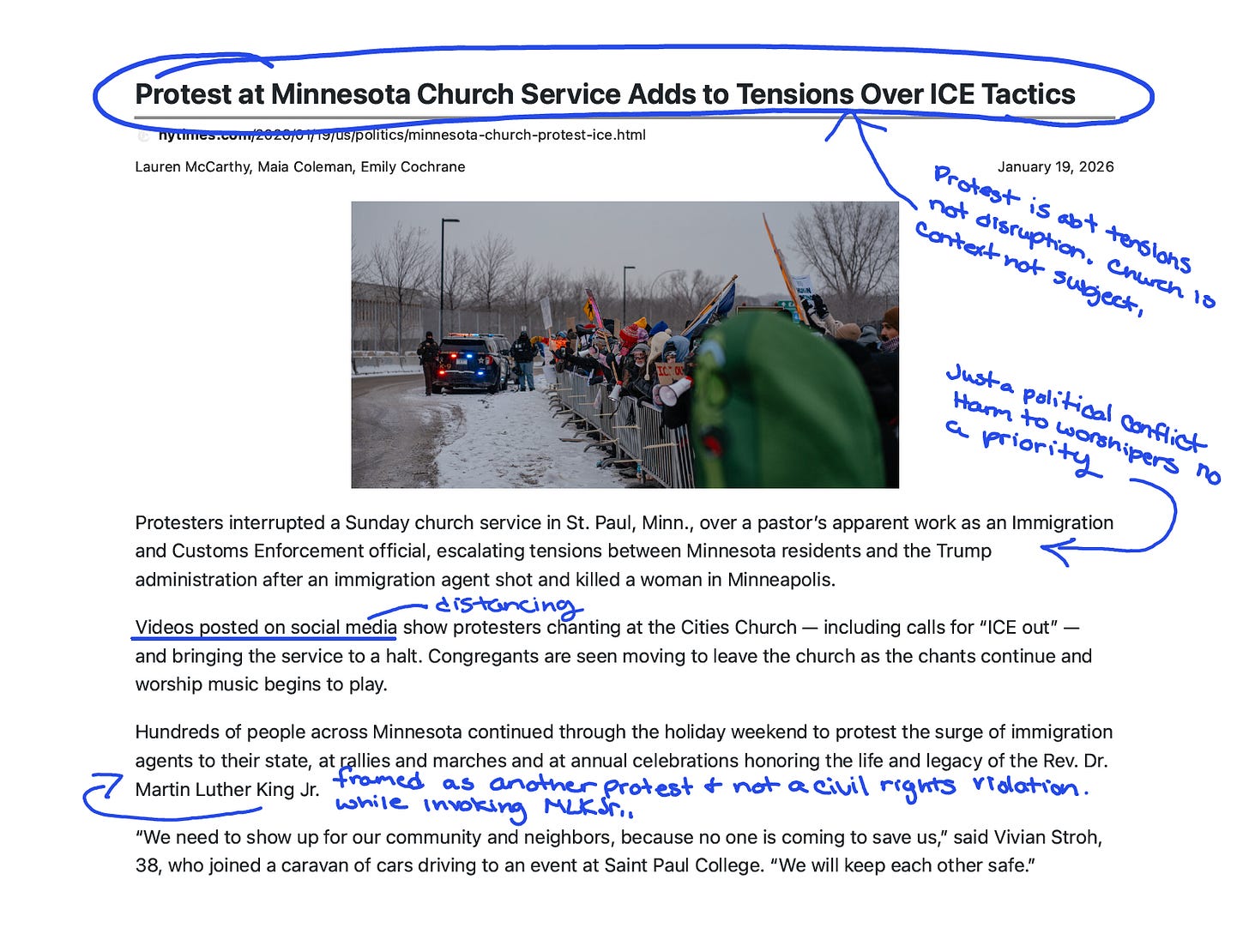 NYT does something similar but in a different direction. They connect the church disruption to MLK Day protests happening across Minnesota, peaceful marches, car caravans, community gatherings.