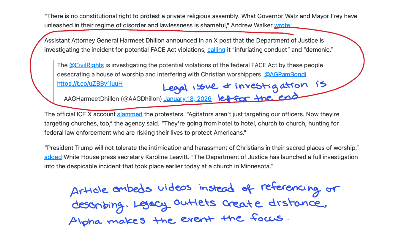 The lesson: Who gets to explain themselves first? Whose emotional experience is prioritized? In legacy outlets, the activist’s rationale is centered. In Alpha, the worshipers’ fear is centered. Neither is lying, but they’re telling you different stories.