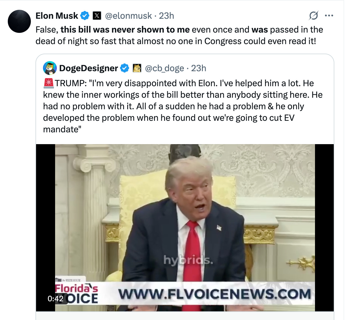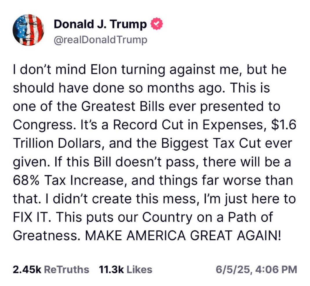 The White House response has been similarly measured. Karoline Leavitt's statement was perfect: "This is an unfortunate episode from Elon, who is unhappy with the One Big Beautiful Bill because it does not include the policies he wanted. The President is focused on passing this historic piece of legislation and making our country great again."