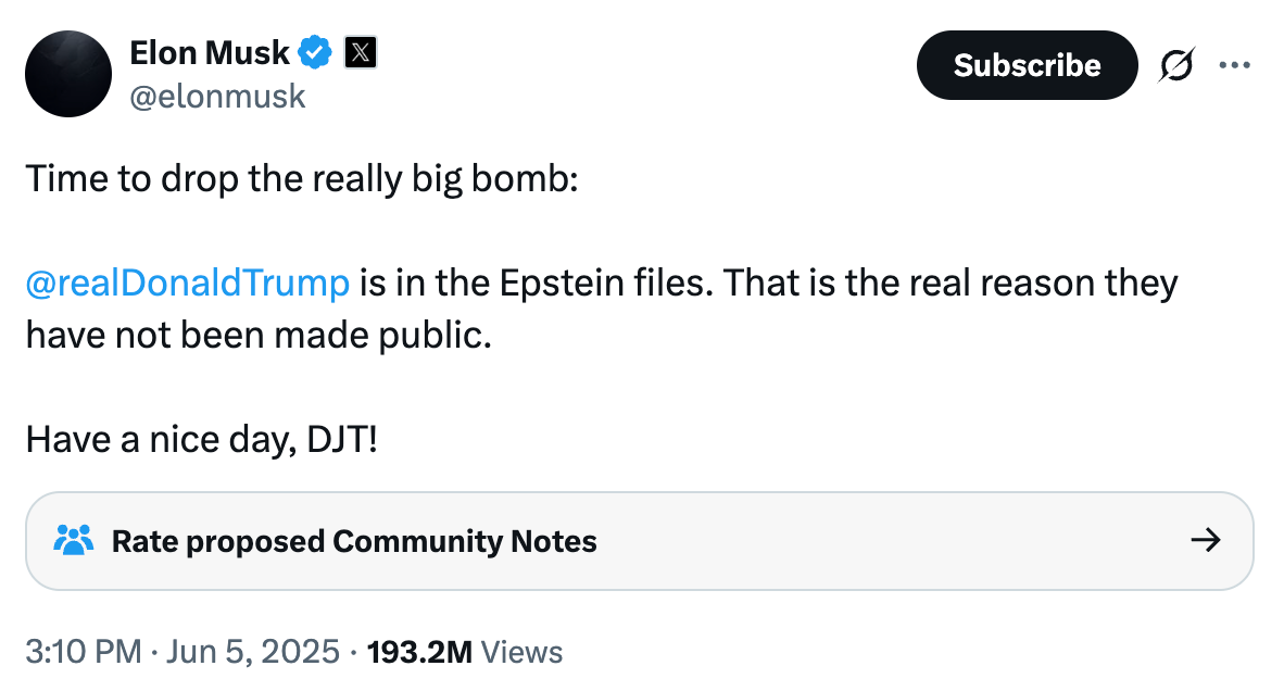 Late Afternoon (3:00 PM ET): And then Musk completely lost his damn mind and dropped what might be the most unhinged accusation in modern political history: