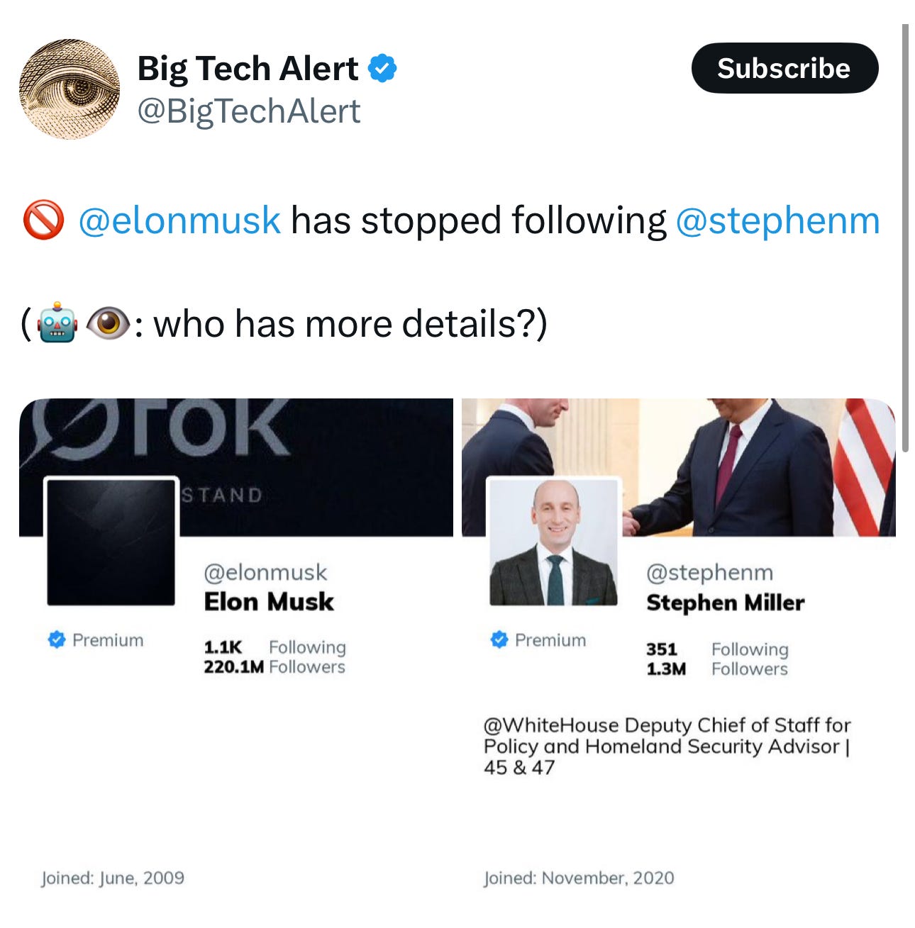 There are also whispers that Musk and Miller had already fallen out before the public Trump blowup. Some are even suggesting that Miller, not little X, might be the real source of that mysterious black eye Musk was sporting recently. If that's the case, the unfollow feels less like coincidental timing and more like the final "screw you" in an already toxic situation.