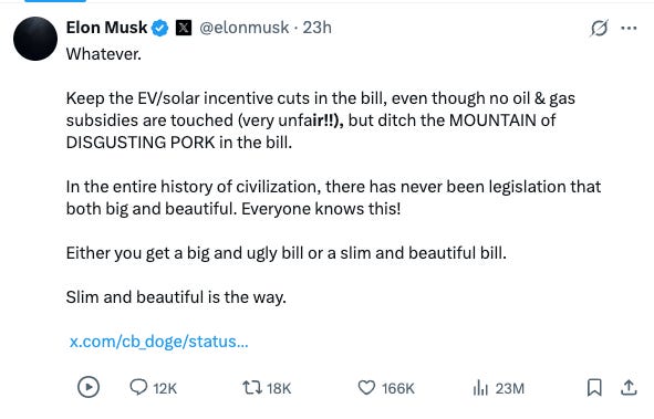 But wait, there's more! He doubled down with a spectacular rant that perfectly captured his frustration: "Whatever. Keep the EV/solar incentive cuts in the bill, even though no oil & gas subsidies are touched (very unfair!!), but ditch the MOUNTAIN of DISGUSTING PORK in the bill. In the entire history of civilization, there has never been legislation that both big and beautiful. Everyone knows this! Either you get a big and ugly bill or a slim and beautiful bill. Slim and beautiful is the way."