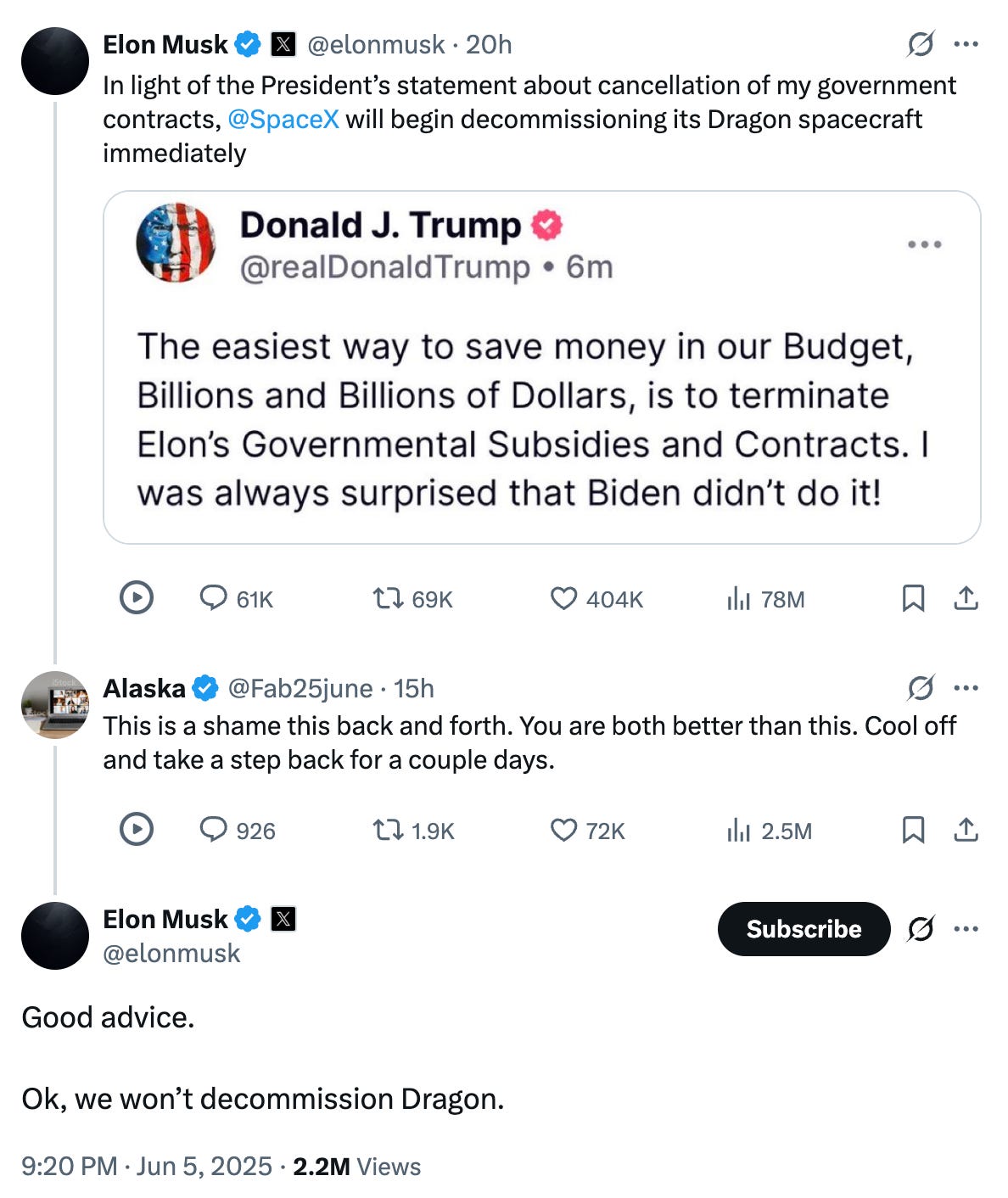 By 9:20 PM, cooler heads (barely) prevailed when a random X user told both men to "cool off." Musk backed down: "Good advice. Ok, we won't decommission Dragon."