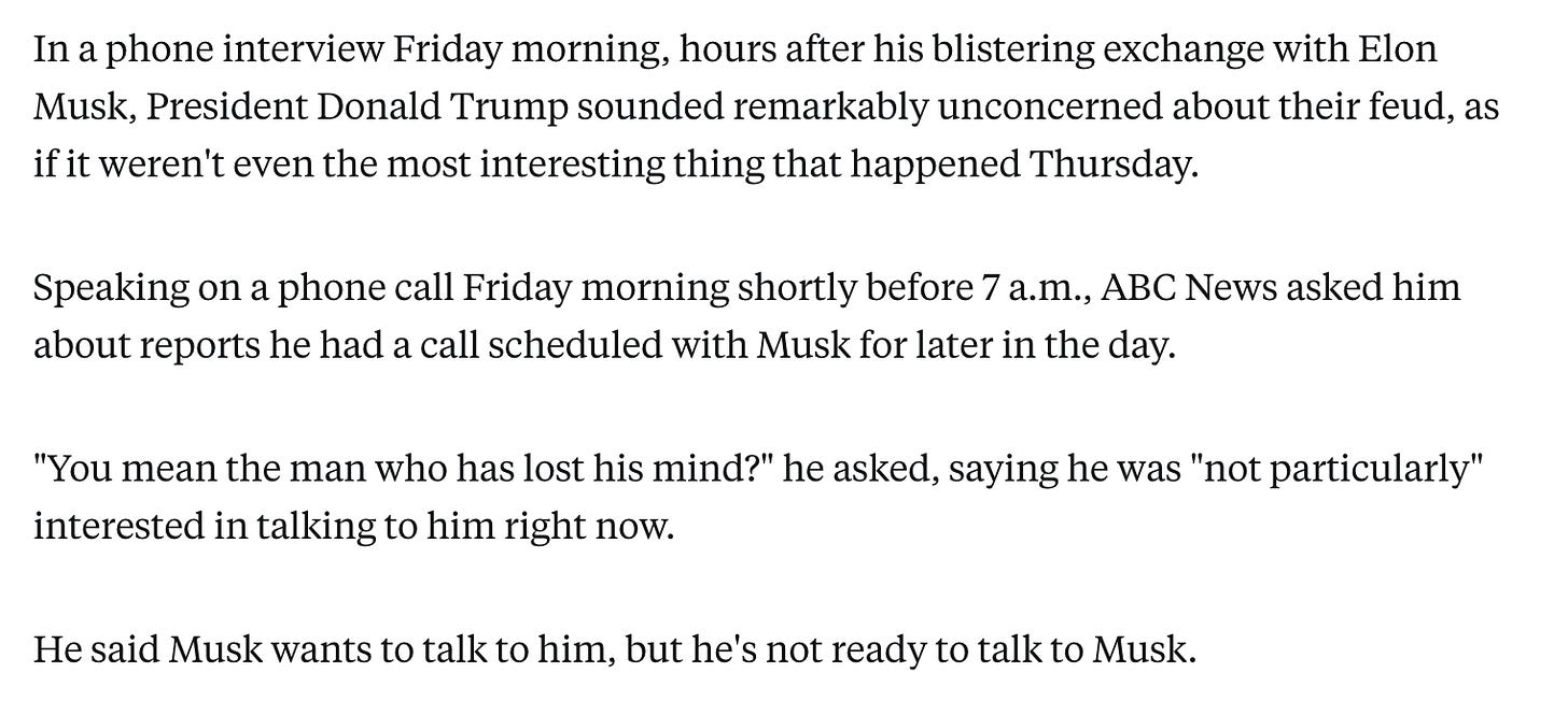 But Friday morning delivered the kill shot. When Jonathan Karl of ABC News (who is known for having a direct line to Trump) asked about reports of a scheduled call with Musk, he replied with devastating casualness: "You mean the man who has lost his mind? I'm not particularly interested in talking to him right now."