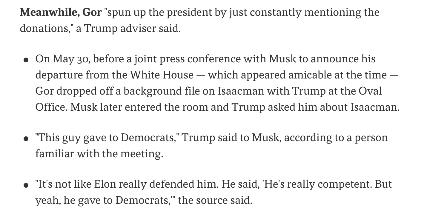 Axios reported that White House personnel director Sergio Gor had been "spinning up the president by just constantly mentioning the donations." On May 30th, before Trump's joint press conference with Musk, Gor dropped off a background file on Isaacman in the Oval Office. When Musk entered, Trump confronted him: "This guy gave to Democrats."