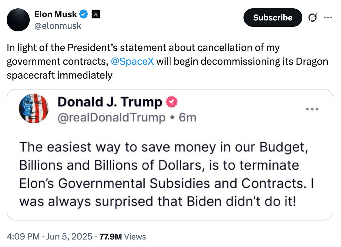 Hold up—so we aren't going to Mars now? This from the man who literally created Space Force because he understood the strategic importance of American dominance in space. Can we acknowledge how monumentally stupid this threat is? For national security reasons, we NEED access to space. Yes, other companies can bid for contracts, but I'd prefer we pick the best option rather than canceling an entire company because the fellas can't play nice in the sandbox.