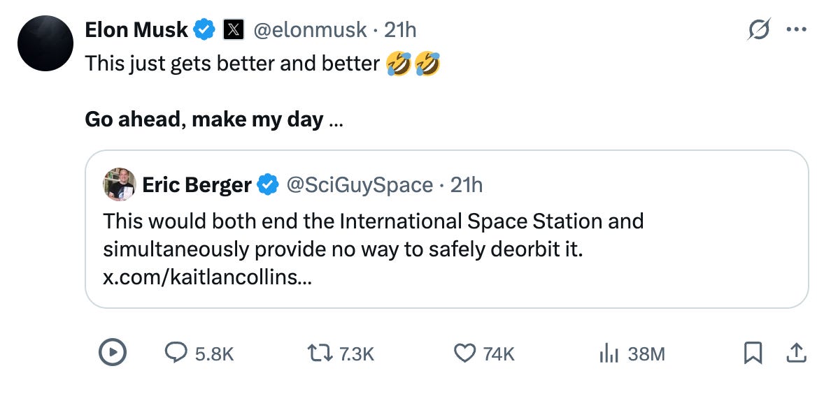 Then he got provactive: "This just gets better and better… Go ahead, make my day…" when someone suggested cutting SpaceX contracts could end the International Space Station.