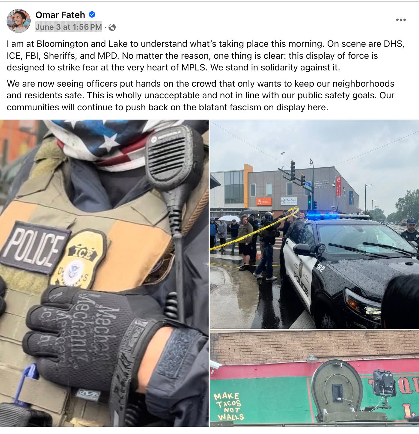 On June 3, 2025, Fateh spotted federal agents at a Mexican restaurant near Bloomington Avenue and Lake Street in Minneapolis. His immediate response? A Facebook post claiming: "On scene are DHS, ICE, FBI, Sheriffs, and MPD. No matter the reason, one thing is clear: this display of force is designed to strike fear at the very heart of MPLS. We stand in solidarity against it."
