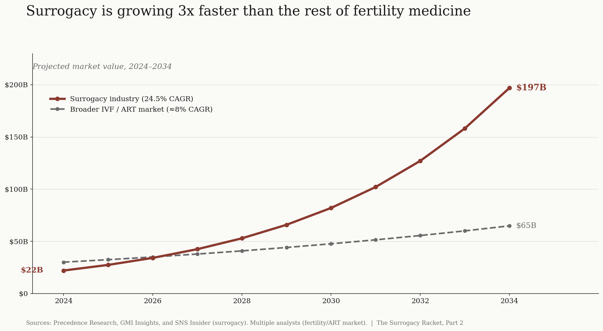 There are many hands in the pot of the global commercial surrogacy industry, and it’s a big one. Three separate market research firms estimate 2024 revenue at roughly $22 billion, with projections approaching $200 billion by 2034. A compound annual growth rate (CAGR) of about 24.5%. That figure is the one worth dwelling on. Most established medical services that simply meet existing health needs grow far more modestly, typically in the single digits (for context, the more common assisted reproductive technology and IVF services market is commonly projected at only 7–9% CAGR over similar periods). Growth at this scale is more characteristic of industries that are actively scaling and expanding their customer base than of markets simply responding to a health crisis or need. Behind that growth is a cultural conviction that biological parenthood is a right — and that whatever stands between a person and that right, whether medical infertility, age, a same-sex partnership, or the choice to parent alone, is a barrier the market should resolve.