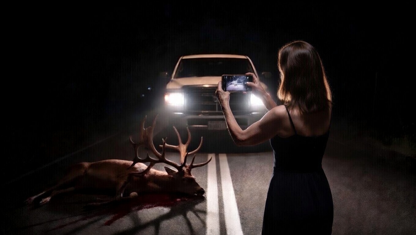 Slowly, she sits up and looks around — no other vehicles. She covers her nose with the back of her wrist when she opens the door. The air is putrid and rotting. The asphalt crunches under her feet as she gets closer to the source of the stench. Black button eyes looking back at her. The head is grotesquely contorted with a hoofed leg caught in its large antlers. It is a mature buck, its broad chest edged with a noble coarse ruff of fur matted with blood. Staring at it, she touches her back. Lifting her phone, she takes a picture, framing only the head. The blood runs onto the asphalt, black. A flood of light washes over her, causing her to shield her eyes from the oncoming headlights. An old pickup truck slows down. A man cranks open the window.
