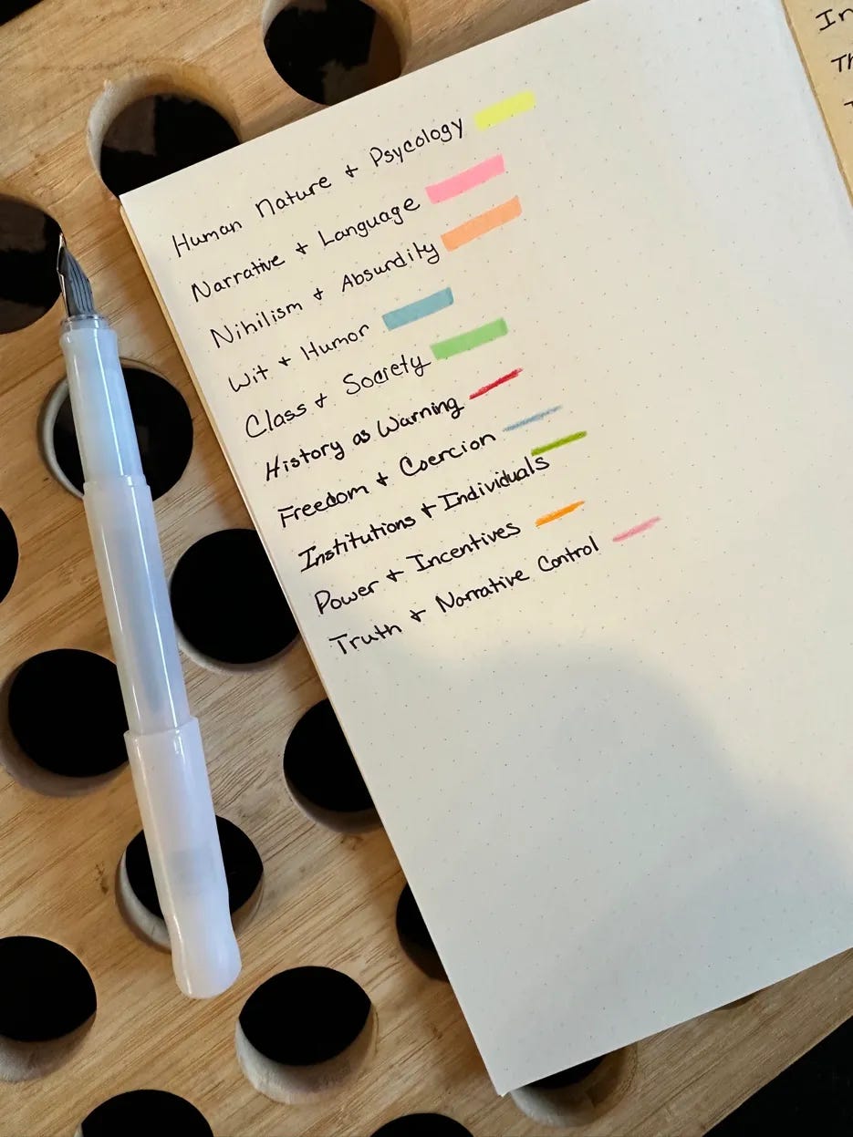But here’s the part I like best: next to each title, I add colored checkmarks corresponding to which thematic categories showed up in that book’s entries. So at a glance, I can see that The Stranger hit on Narrative & Language and Nihilism & Absurdity, while The Road to Serfdom touched nearly every category in the key.