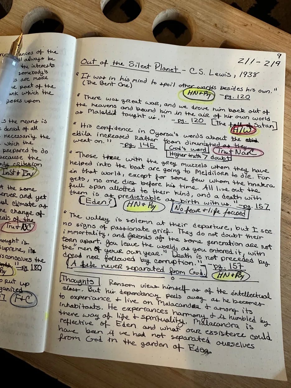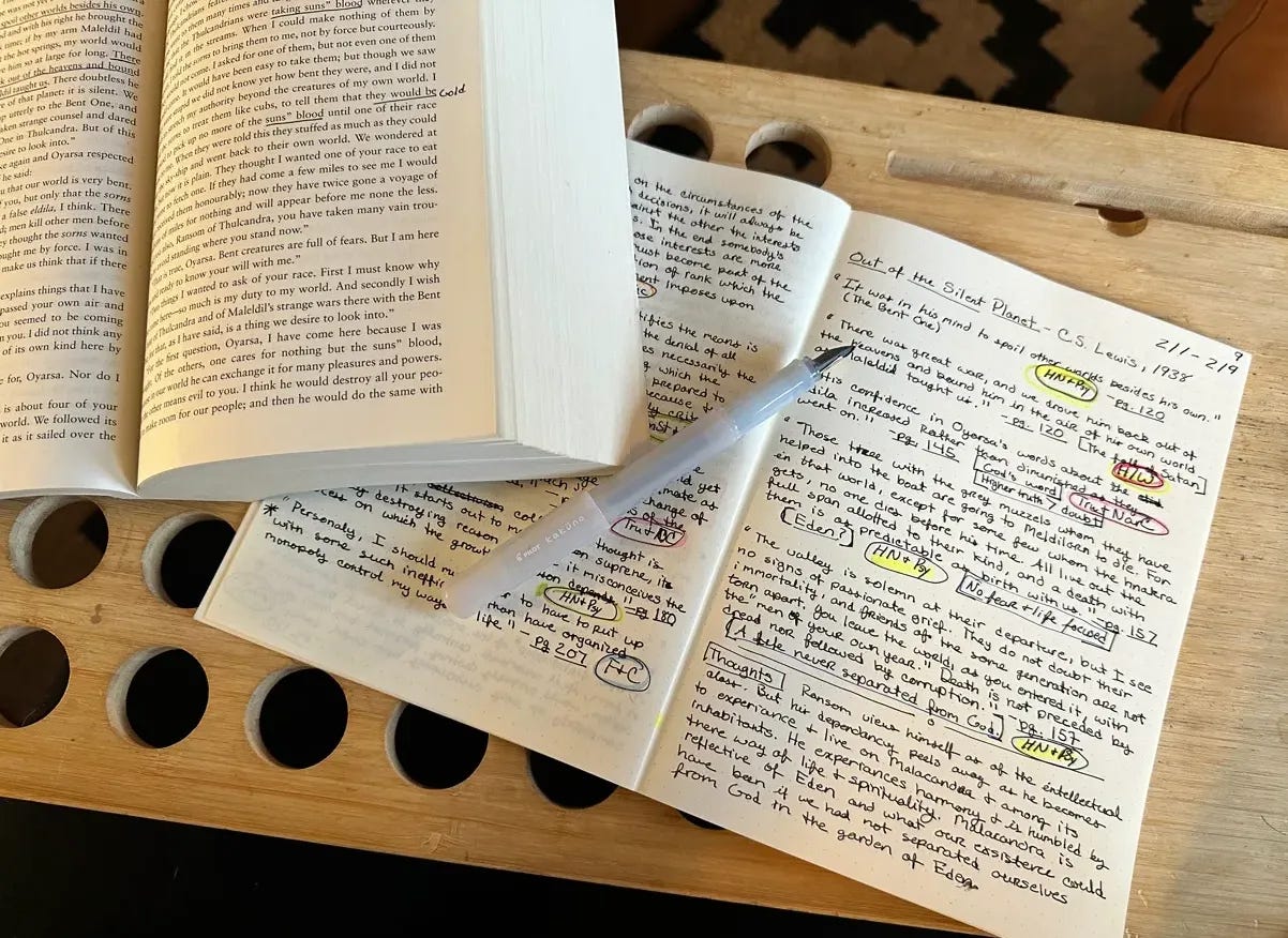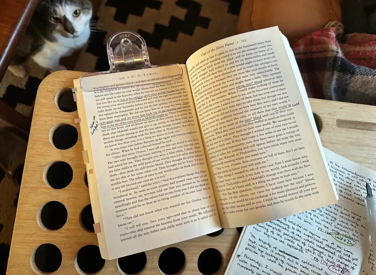One more tool worth mentioning: a book clip. You can see it in the photo, holding my copy of Out of the Silent Planet open. When you're copying quotes by hand, you need both hands free—one for the pen, one for steadying the notebook. A clip keeps your source book open to the right page without you fighting the spine. I can't remember the brand of mine, but you can find similar ones on Amazon or Jet Pens.