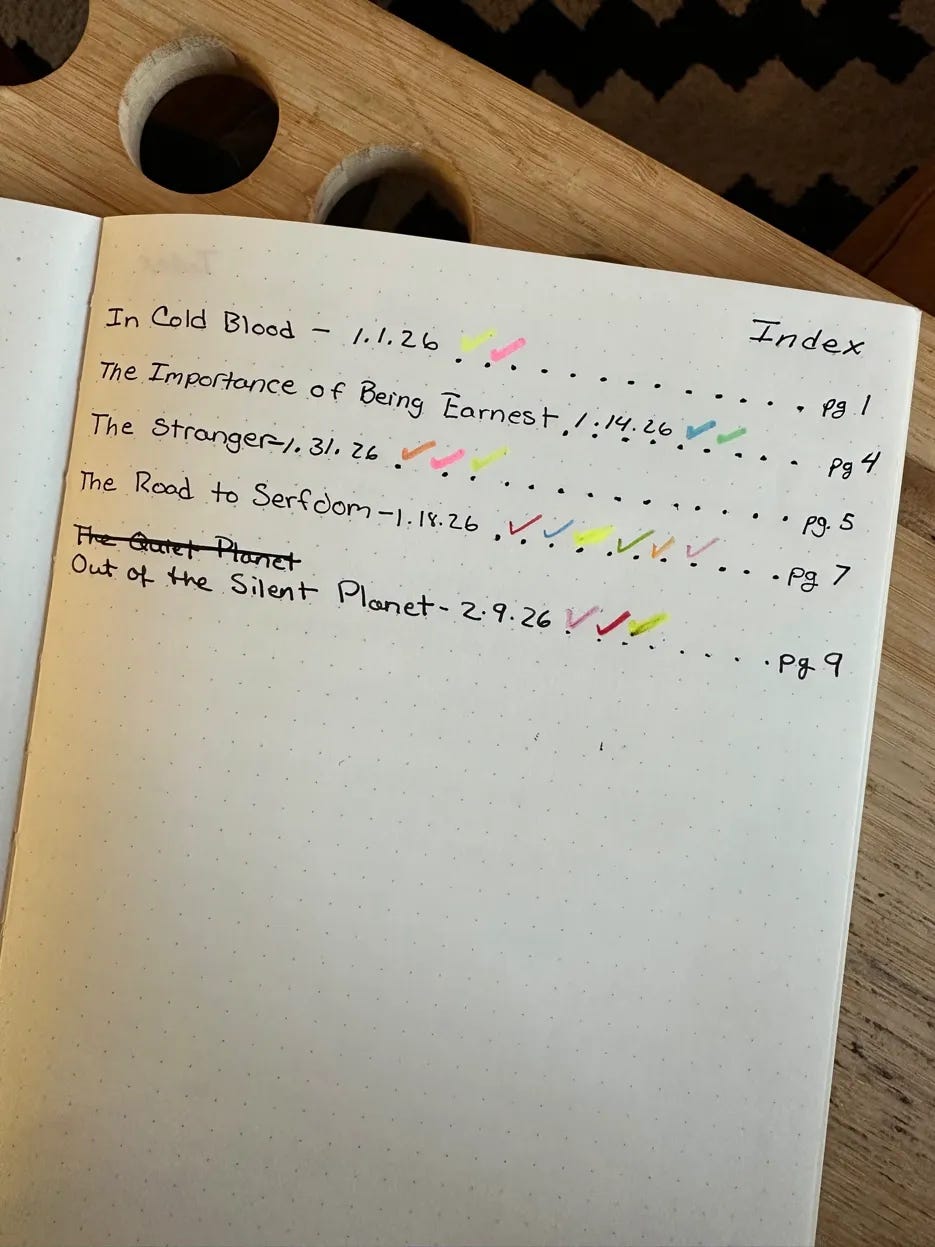 It’s a small thing, but it turns the notebook into something searchable. If I’m writing about narrative control and want to pull from my reading, I can scan the index and see which books had something to say about it.