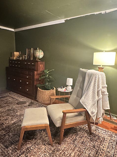 I have drenched this office in Mountain Olive by Behr, and I am absolutely in love with it — walls, ceiling, trim, all of it. It’s my favorite tone of green. It’s dark. It’s moody. It’s comforting. It’s everything I wanted this room to be.