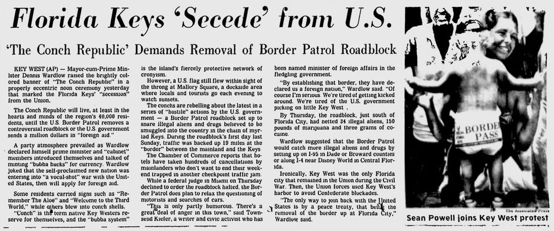 In the spring of 1982, the U.S. Border Patrol set up a roadblock on U.S. Route 1 at Florida City, the only road that connects the Florida Keys to the mainland. The stated purpose was to intercept undocumented immigrants and drug smugglers. The practical effect was treating every single person leaving Key West like they were crossing an international border. Cars were backed up for miles. Tourism cratered. The locals, already a particular breed of sun-drenched, salt-worn, very-much-not-interested-in-your-federal-nonsense types, were furious.
