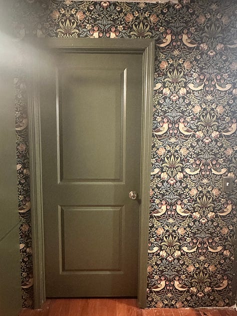 I found the wallpaper on the Home Depot website. It comes in two colorways — black and green — though the “black” version is really just a dark background with the detail rendered in green tones, along with the most charming red strawberries. It’s a genuinely lovely pattern.