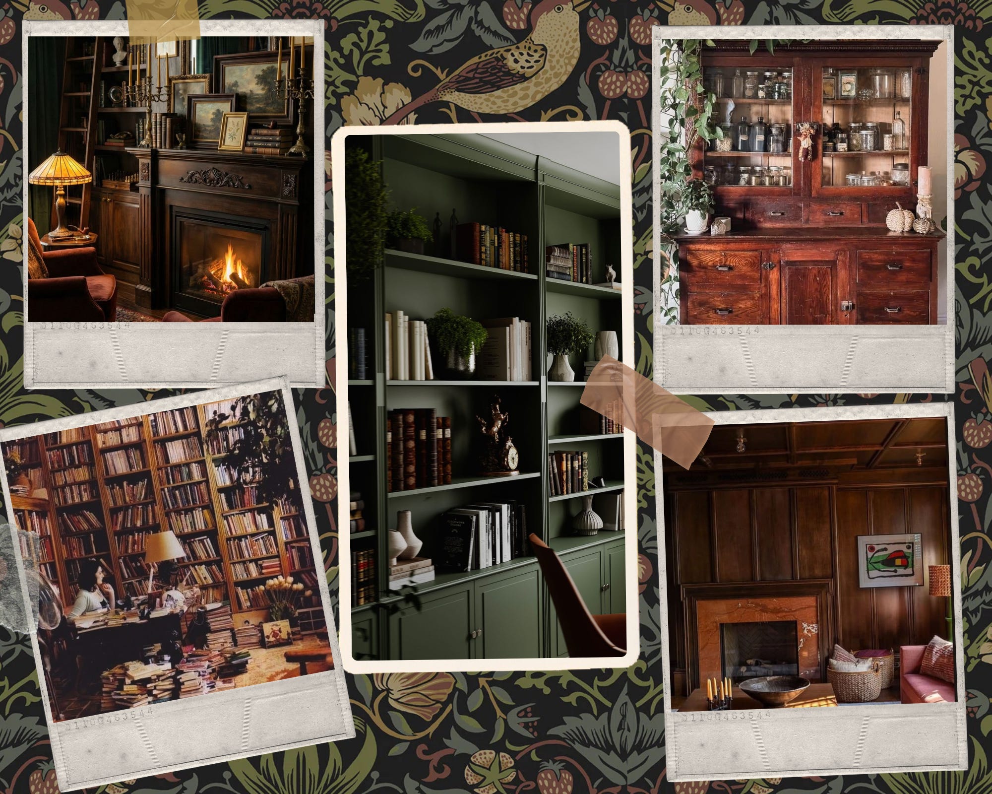 A room flooded with my favorite green, accented with dark wood, dark cozy corners, and books. I want a wall of books and notebooks.