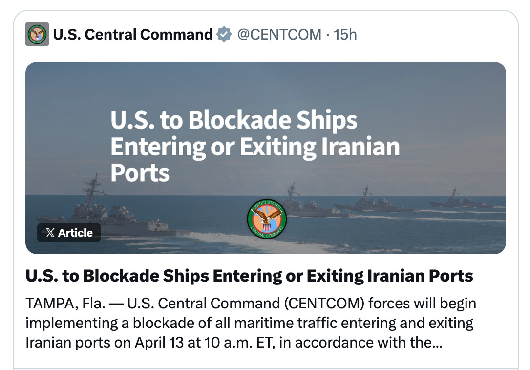Trump responded Sunday morning on Truth Social and then on Fox News’ Sunday Morning Futures, announcing a sweeping “all or nothing” blockade effective today. CENTCOM begins enforcement at 10 a.m. ET. No selective access for China, India, or Pakistan. The U.S. Navy will intercept any vessel that paid Iran’s $1-per-barrel toll in Chinese yuan or crypto, and will begin destroying mines Iran laid in the strait.