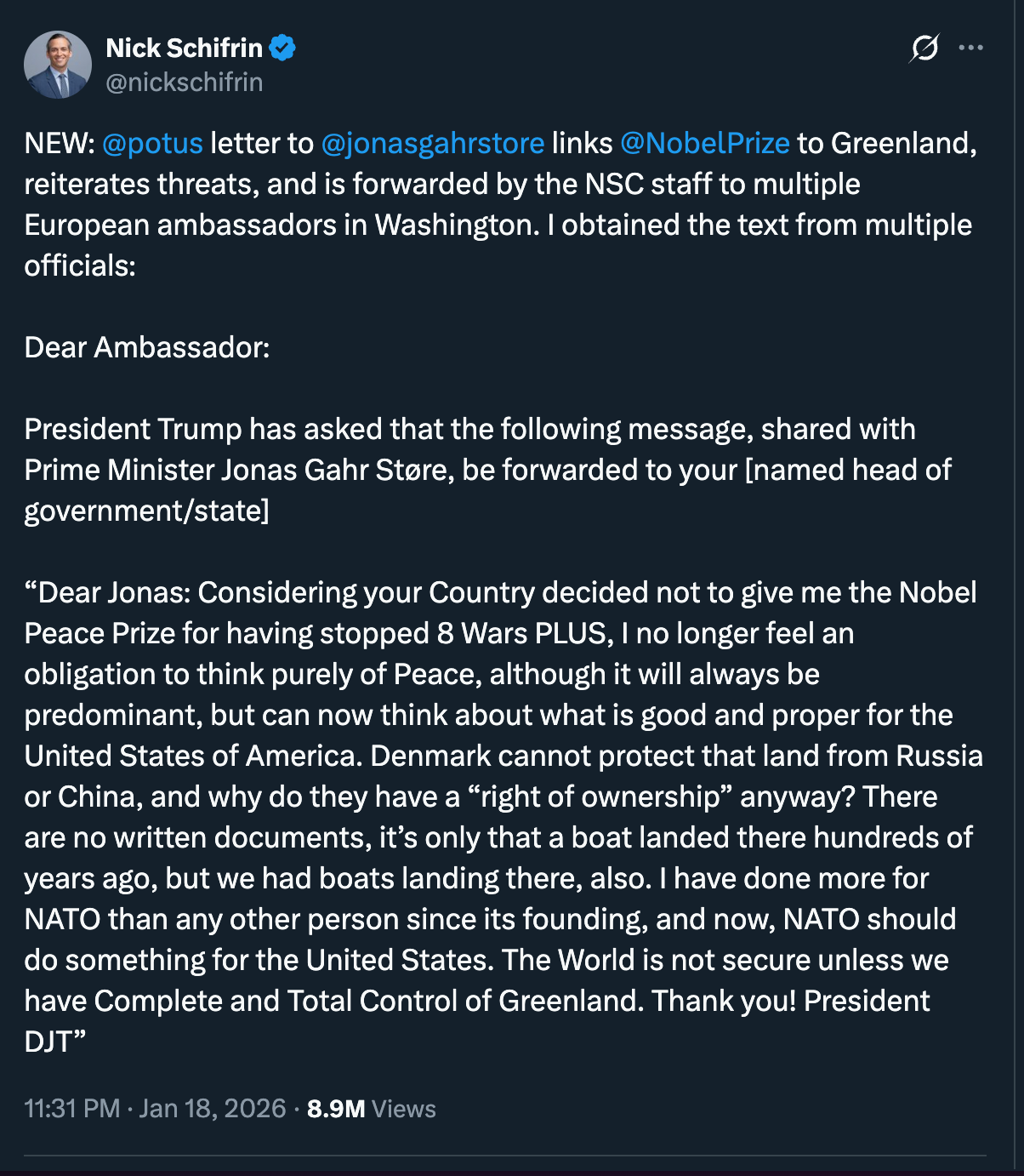 According to Politico, Norwegian Prime Minister Jonas Gahr Støre confirms that Trump sent a letter explicitly linking his Nobel Peace Prize snub to his Greenland ambitions. The letter reportedly reiterates threats against NATO allies over the Arctic territory. Perhaps more notable: PBS News reports that National Security Council staff forwarded the letter to several European ambassadors in Washington—a move that reads less like diplomacy and more like a warning shot.