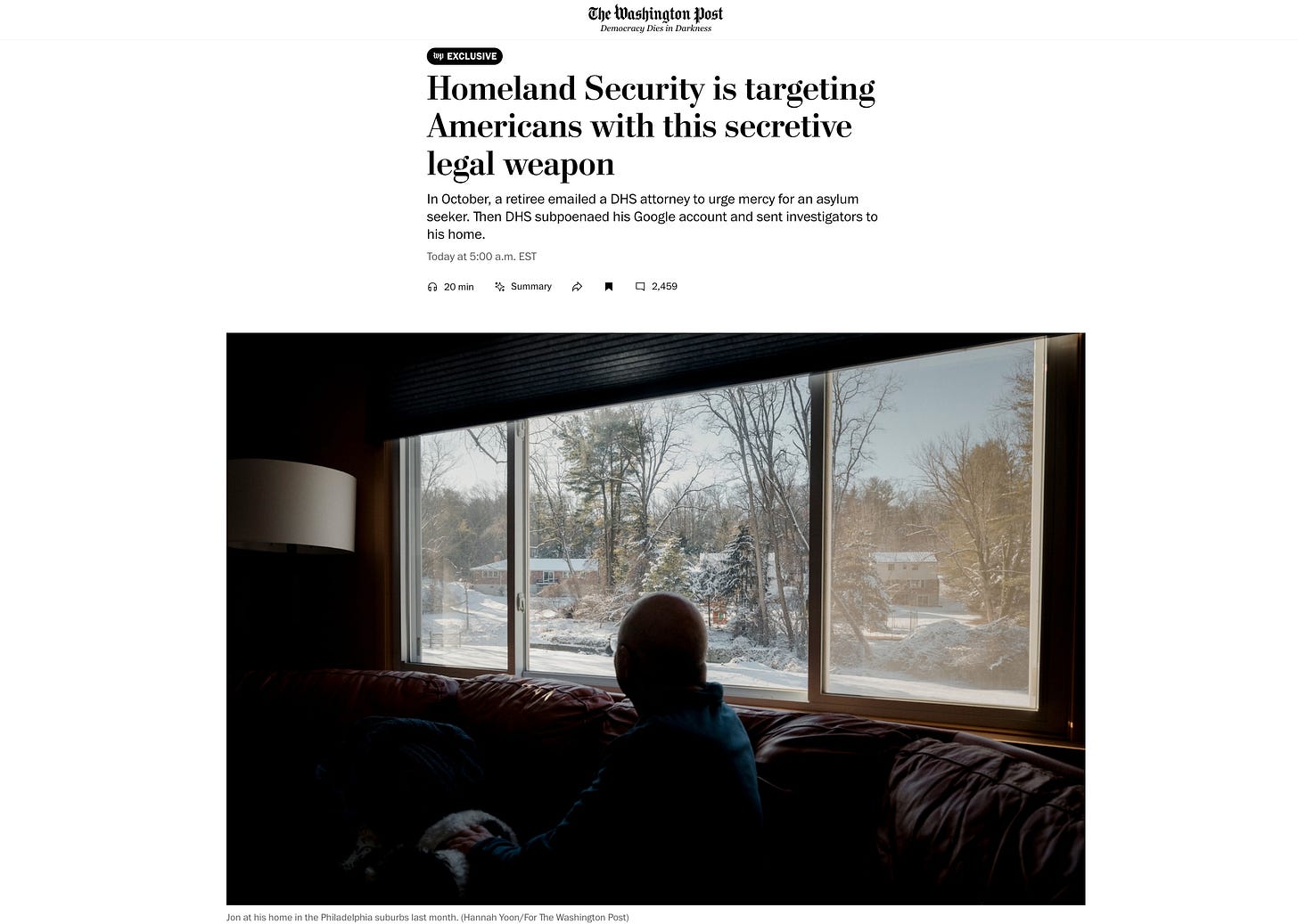 The article opens with Jon, a 67-year-old retiree, recently naturalized, peering through metal-rimmed glasses, worried about his wife panicking. He’s sympathetic. He’s relatable. He sent a four-sentence email to a federal prosecutor, and now the government is coming for him.