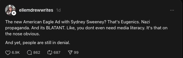 The viral post from on TikTok @midwesterngothic captured the zeitgeist perfectly: "I will be the friend that is too woke because these Sydney Sweeney AE ads are weird, like fascist weird, like Nazi weird" garnered over 500k likes. Another user chimed in with "pushing blue eyes, blonde hair in this political climate is crazy. oh my" because heaven forbid an attractive blonde appear in an advertisement.