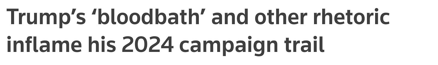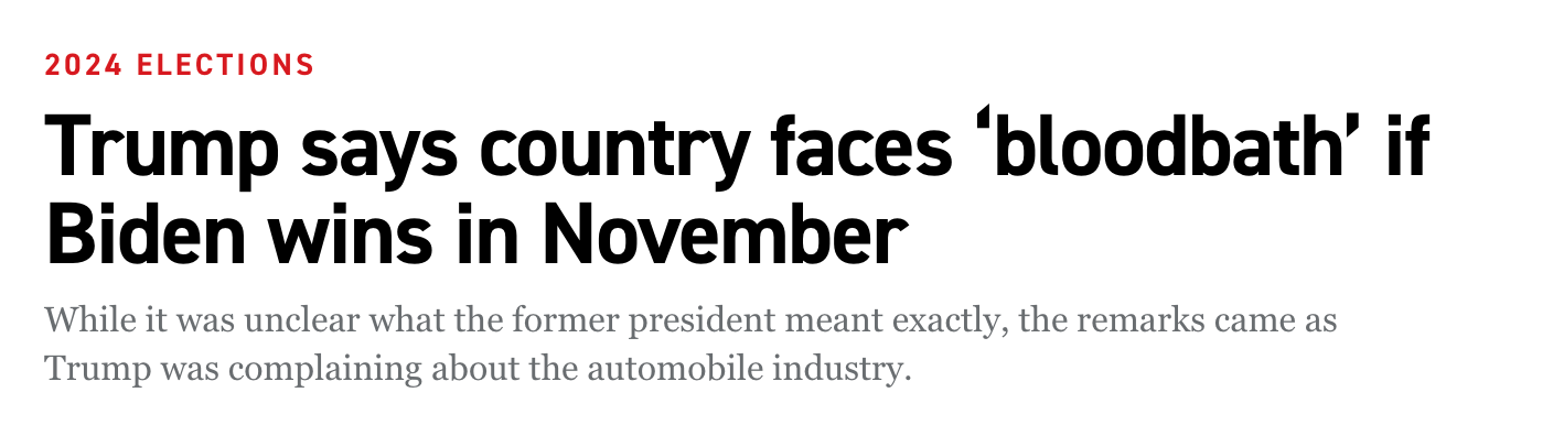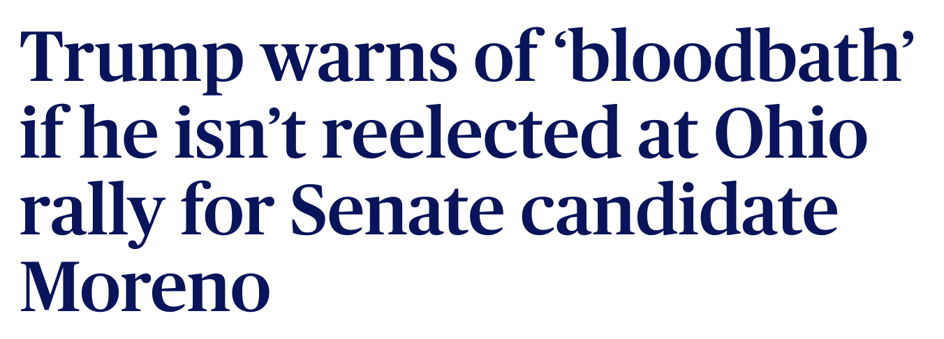 “Now, if I don’t get elected, it’s gonna be a bloodbath. That’s going to be the least of it,” Trump said during a rally near Dayton, Ohio. “It’s going to be a bloodbath for the country.”