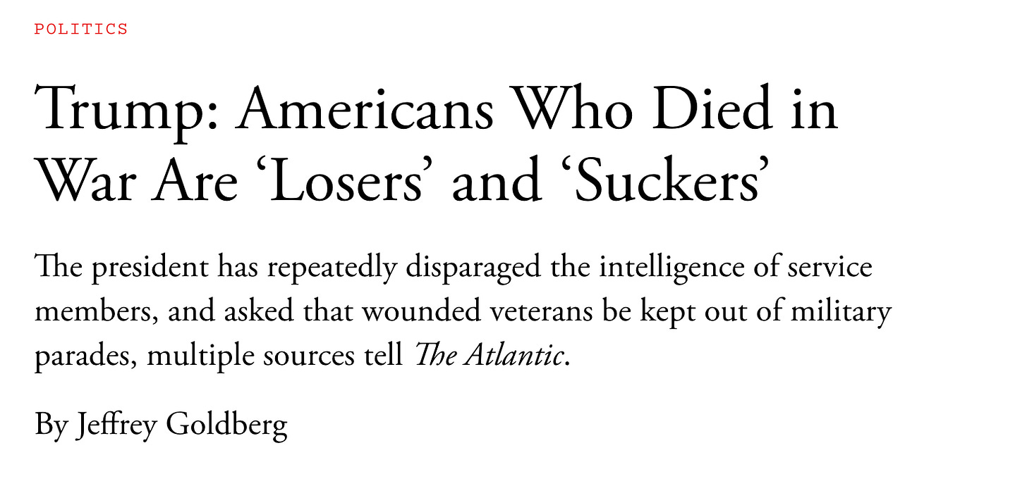 The origin of the "sucker and losers" story will be very familiar to you if you listen to our UNfiltered episode because it involves the very same players who alleged that Trump admired Hitler — John Kelly, The Atlantic, and Jefferey Goldberg.