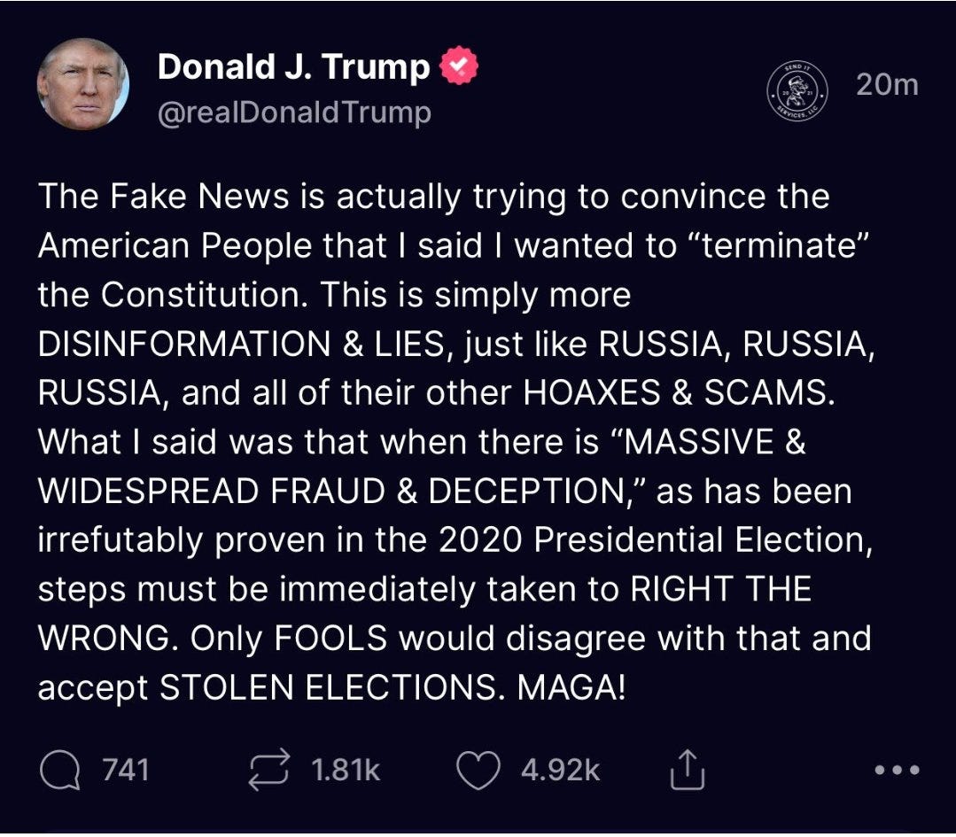 The following day, Trump made another post on Truth to clarify his statements and refute media claims that he advocated for terminating the Constitution. He reiterated that the Twitter Files provided evidence he believed proved the election was stolen due to censorship carried out by Twitter, with guidance from the intelligence community and Democrats in the federal government.