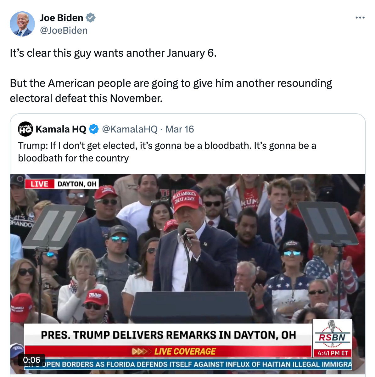 The media and Biden's team once again twisted Trump’s words to fit their tired narrative and sew division, pretending his warning of an economic “bloodbath” if Biden wins some veiled call for violence. It’s beyond clear that Trump was talking about the economic disaster he believes will follow another Biden (now Harris) term—common sense tells you that much. But instead, the mainstream media and Biden went for the cheap shot, snipping out context and leaving viewers with the impression that Trump was threatening Americans.